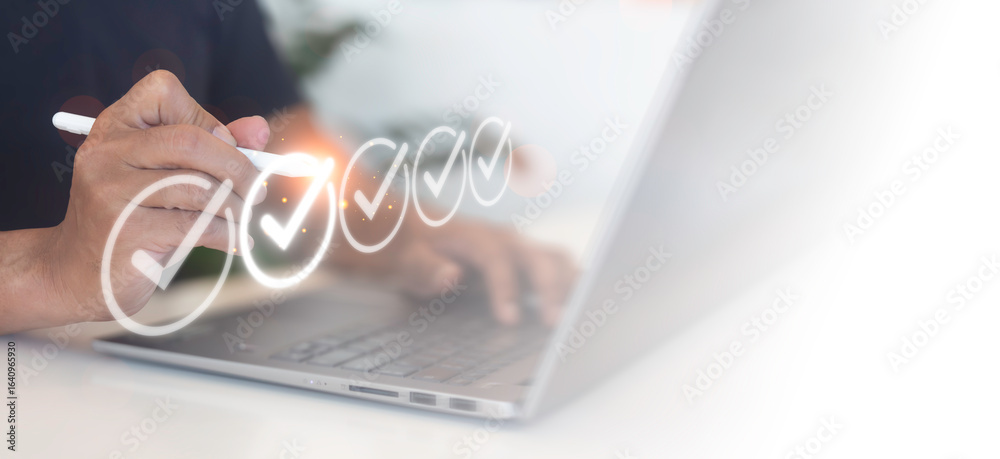 Answer the test questions concept. Businessmen tick mark an assessment, questionnaire, evaluation, online survey online exam choose the right answer in the exam, filling out an online survey form.
