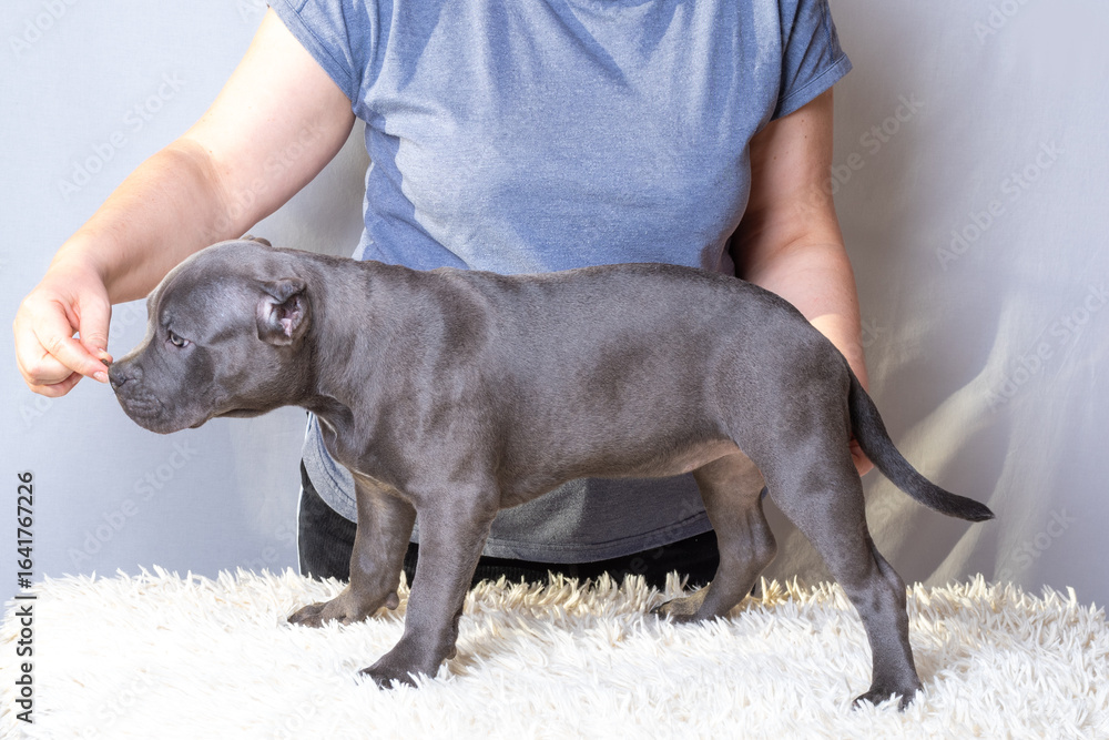 Blue Staffordshire Bull Terrier puppy being trained indoors on white fluffy rug. concept of dog training