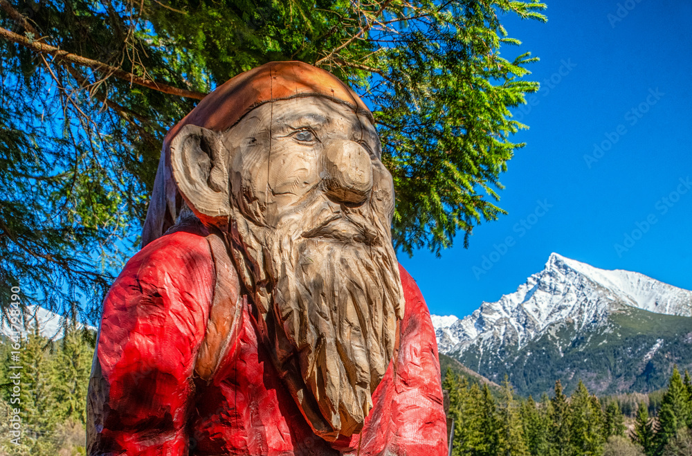 Wooden statue of goblin in forest with high peak and mountains