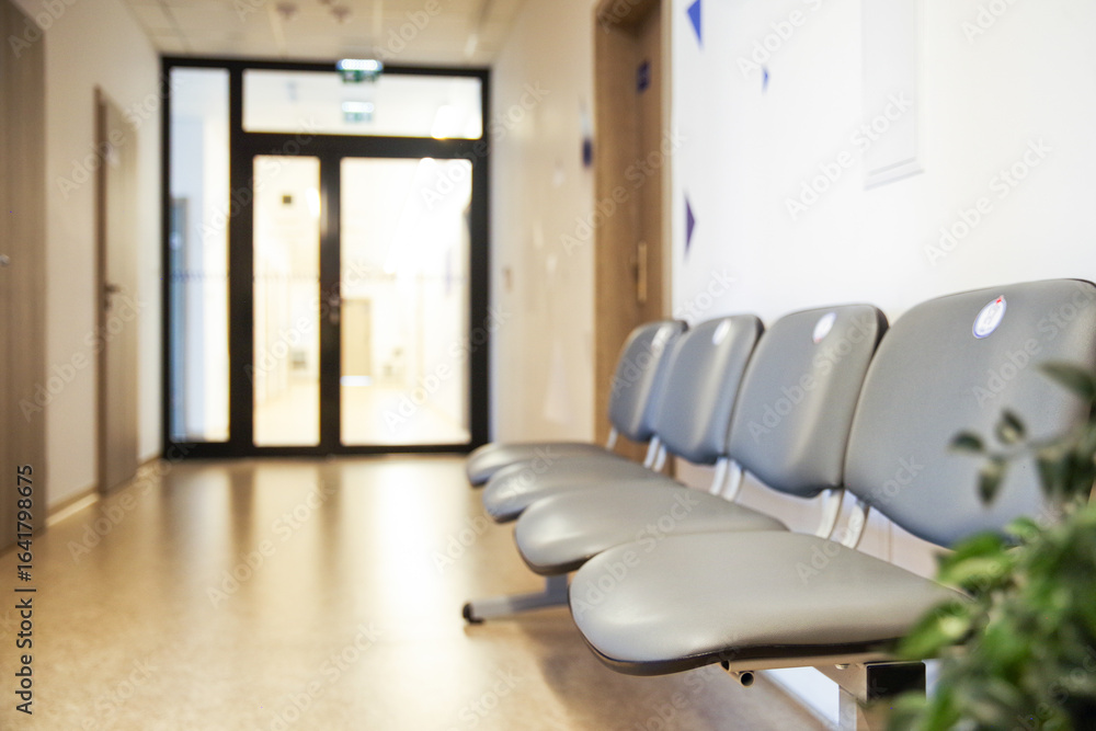 Empty row of gray chairs in bright hospital or clinic waiting room, clean modern corridor with natural light and calm atmosphere