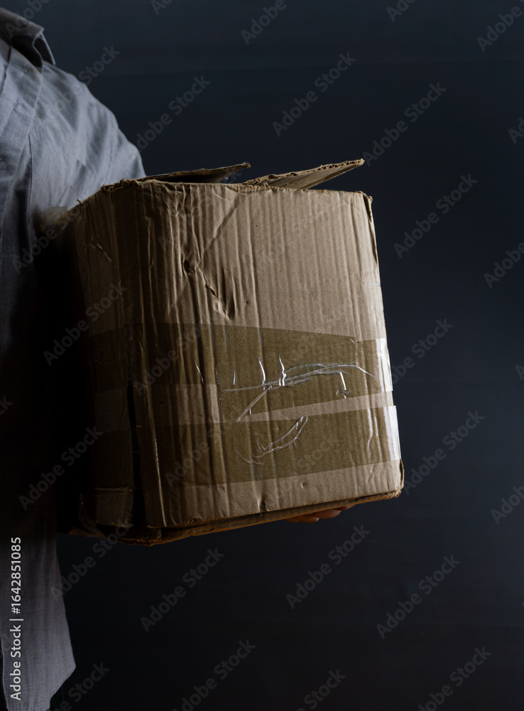Brown cardboard box carried by a man in a shirt, isolated on black background, vertical frame composition for delivery, moving, or packaging concept.