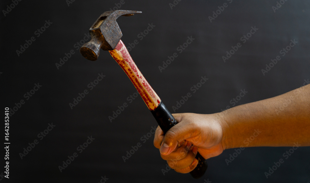 Hammer gripped by a man’s hand on its black rubber handle, black background, ideal for construction, repair, or carpentry concept visuals.