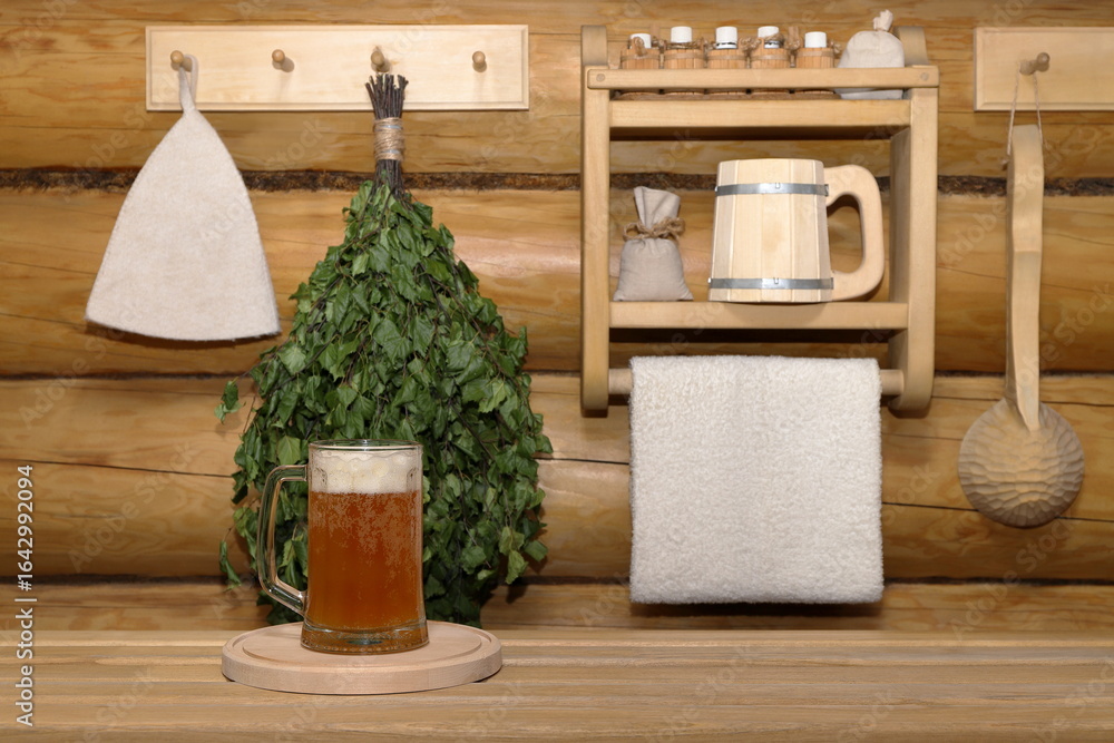 A glass mug of light beer on a wooden tray is placed on a plank bench against a log wall with a dry birch broom, a wooden ladle, a hat, a shelf with sauna utensils and a white towel.