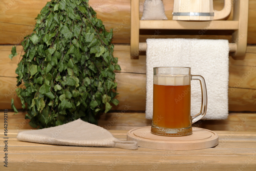A glass mug of light beer on a wooden tray is placed on a plank bench next to a sauna hat against a log wall with a dry birch broom, a shelf with sauna utensils and a white towel.