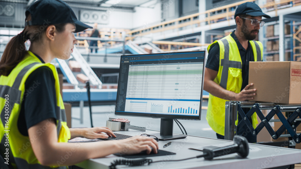 Caucasian Female Stocking Associate Using Desktop Computer To Check Inventory In Distribution Facility. Multiethnic Colleague Loading Cardboard Boxes With Online Orders On Automated Conveyor Belt