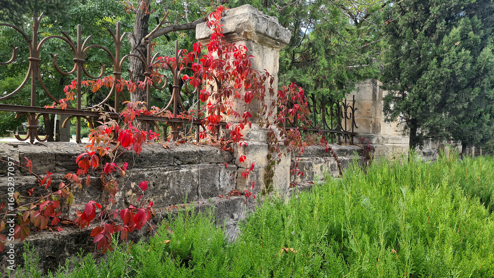 A weathered stone wall covered with vibrant red ivy, surrounded by lush green grass and trees, illustrating the concept of nature reclaiming urban spaces.