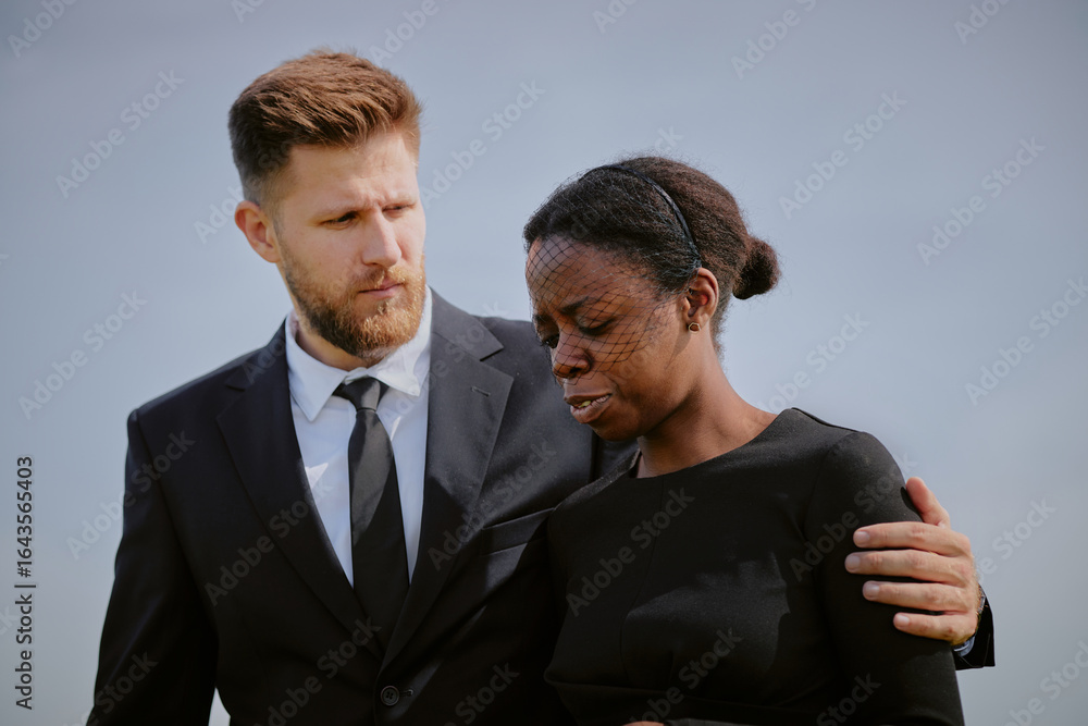 Caucasian young adult man comforting Black young adult woman wearing mourning veil outdoors during funeral ceremony, man placing arm around woman as she appears emotional