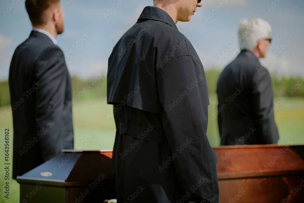 Three men including young adult Caucasian man, middle aged Caucasian man, senior Caucasian man standing beside wooden casket outdoors during funeral ceremony in daytime