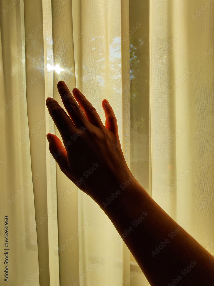 Silhouette of woman's hand on background of window with tulle curtain at sunset. Woman's hand touches transparent yellow curtain. Close-up. Copy space.