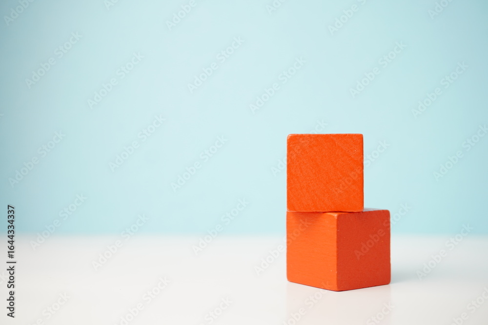 Two orange wooden cubes stacked against a blue backdrop, showcasing versatile wooden cubes on clean background for business, health and education concepts.