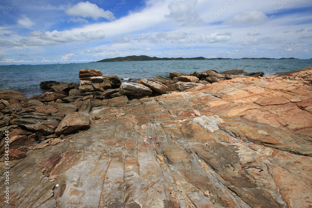 Wet rock formations with patterns on the beach and a bright blue sky filled with clouds.