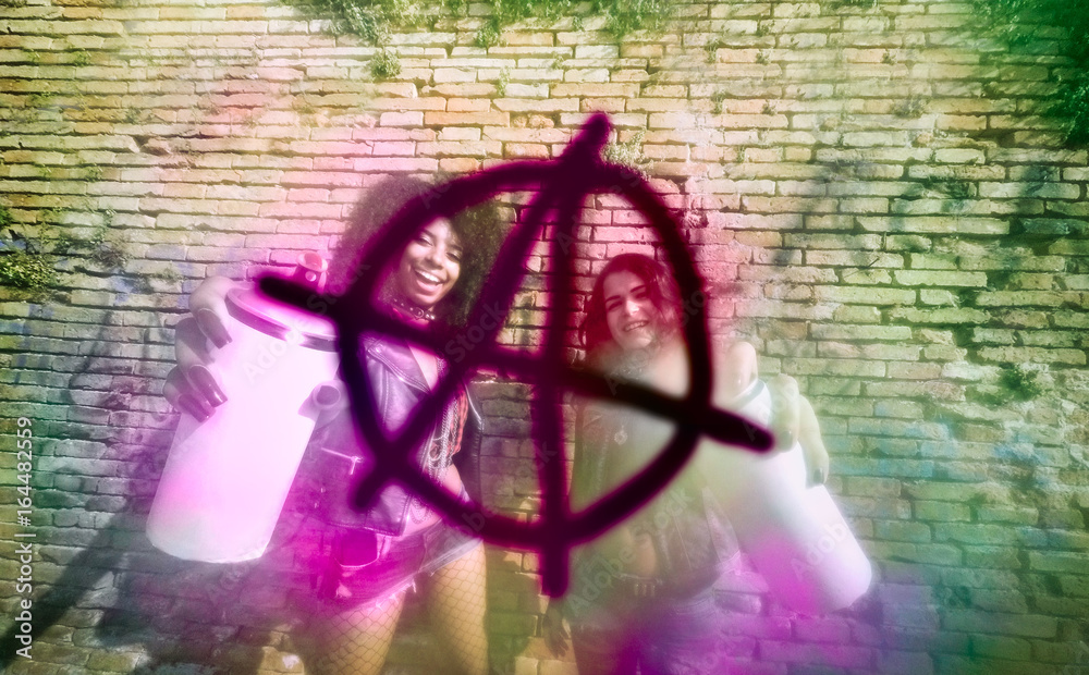 punk girls spray on wall. multi-racial teenage girls with color spray drawing anarchy symbol on a urban brick wall underground