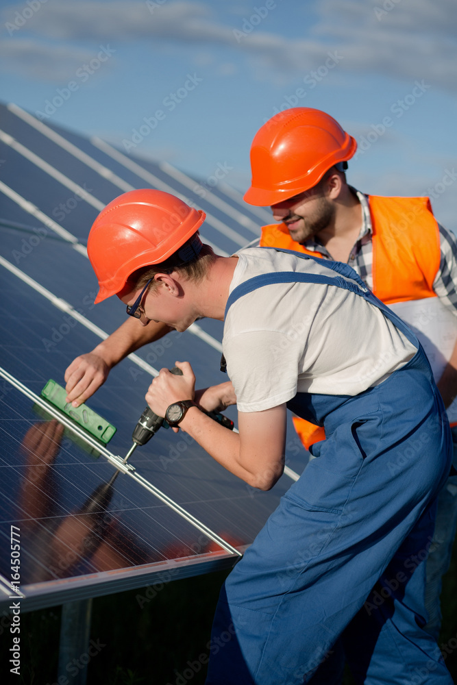 Technicians installing photovoltaic panels at solar power station. Workers checking solar panels equipment.