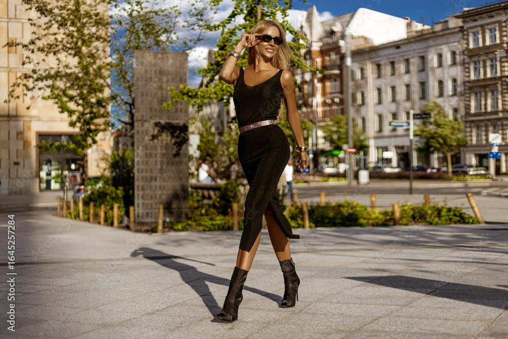 Fashionable woman in elegant black sleeveless midi dress with ankle boots and sunglasses posing confidently in sunny European city street, modern urban chic style