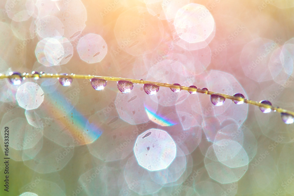 Drops on the plants after rain. Morning light and beautiful pink bokeh