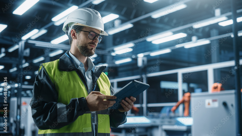 Thoughtful Caucasian Male Engineer Walking with a Tablet Computer, Monitoring Conditions at an Automated Industrial Machinery Assembly Line with Robot Hands Powered By Artificial Intelligence.