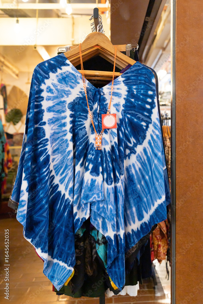 A vibrant blue tie-dye patterned poncho is displayed on a wooden hanger in a stylish fashion store, showcasing intricate designs and a colorful bohemian style in elegant indoor lighting.