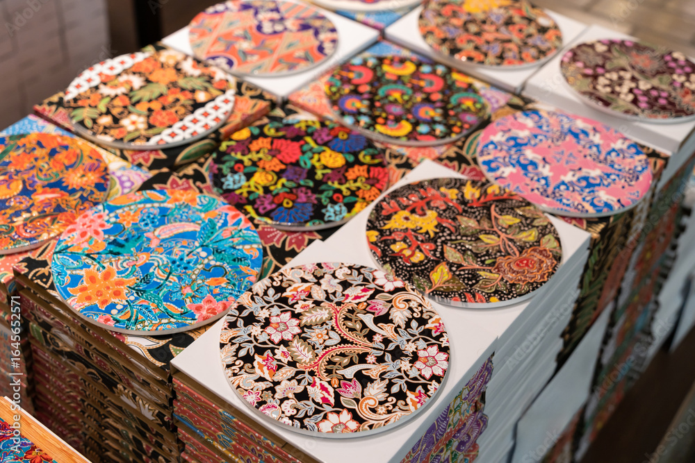 Decorative ceramic trivet with intricate patterns arranged neatly on white box stacks, showcasing vibrant colors and artistic designs in a market or retail environment.