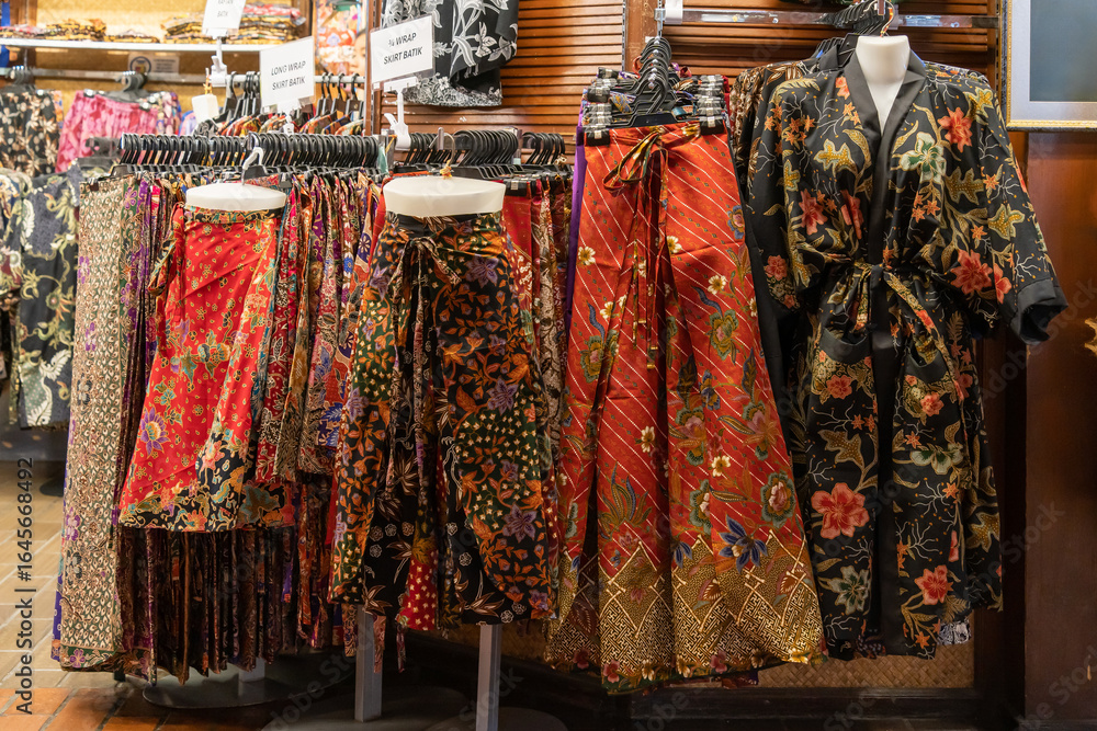 A collection of traditional batik garments with intricate patterns displayed in a retail setting.