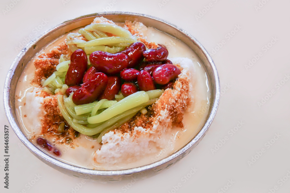 Close up of the cendol dessert with gula Melaka syrup.