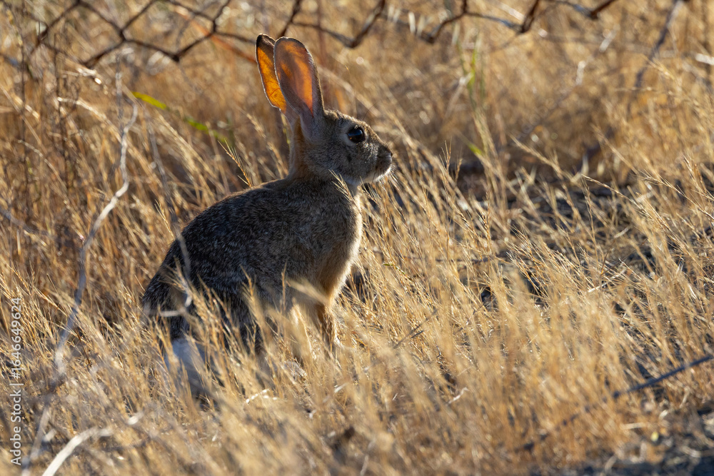 Very close view of a Cottontail rabbit, seen in the wild In North California