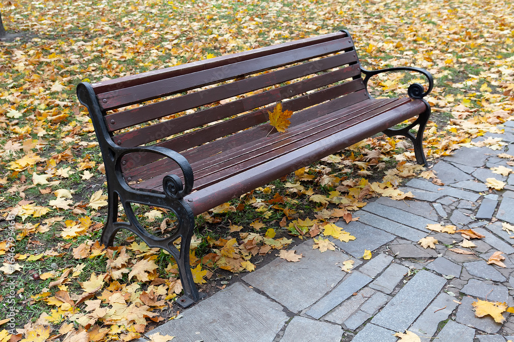 A wooden bench on the alley in the park strewn with yellow leaves