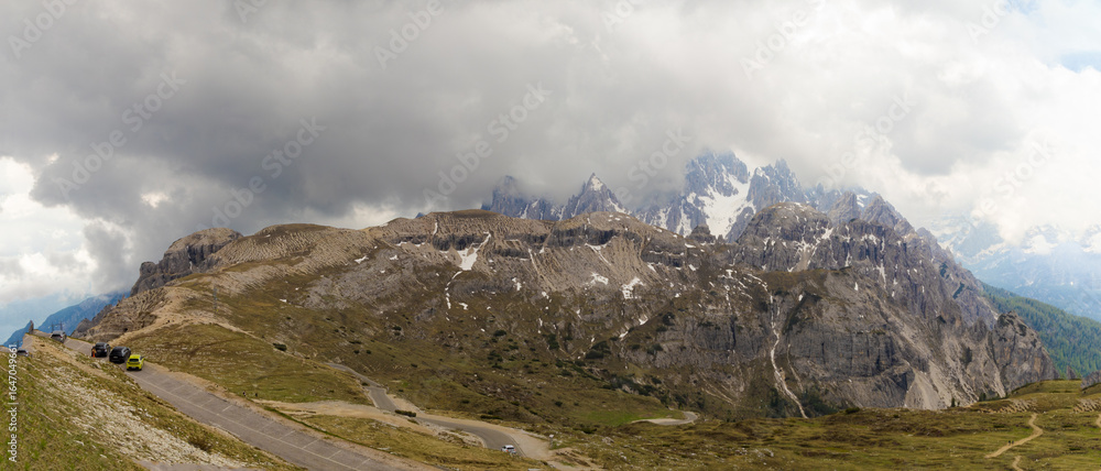 Panoramic view of Croda dei Toni from Tre Cime di Lavaredo, with rugged cliffs, cloudy sky, alpine road, and patches of snow in the Dolomites.