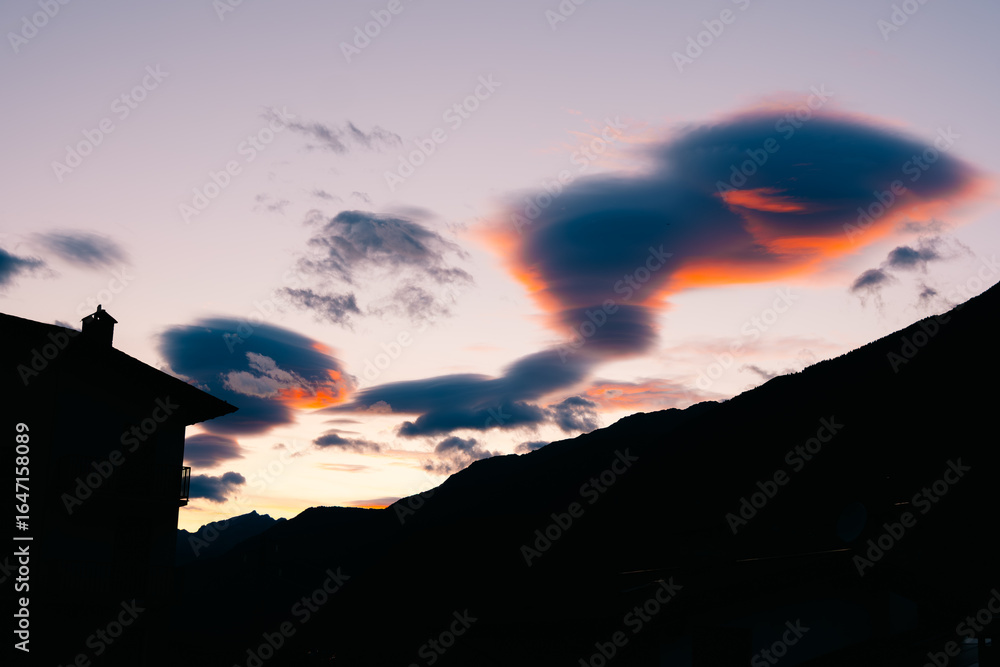 Pastel pink lenticular clouds drifting over mountain silhouette in serene evening sky