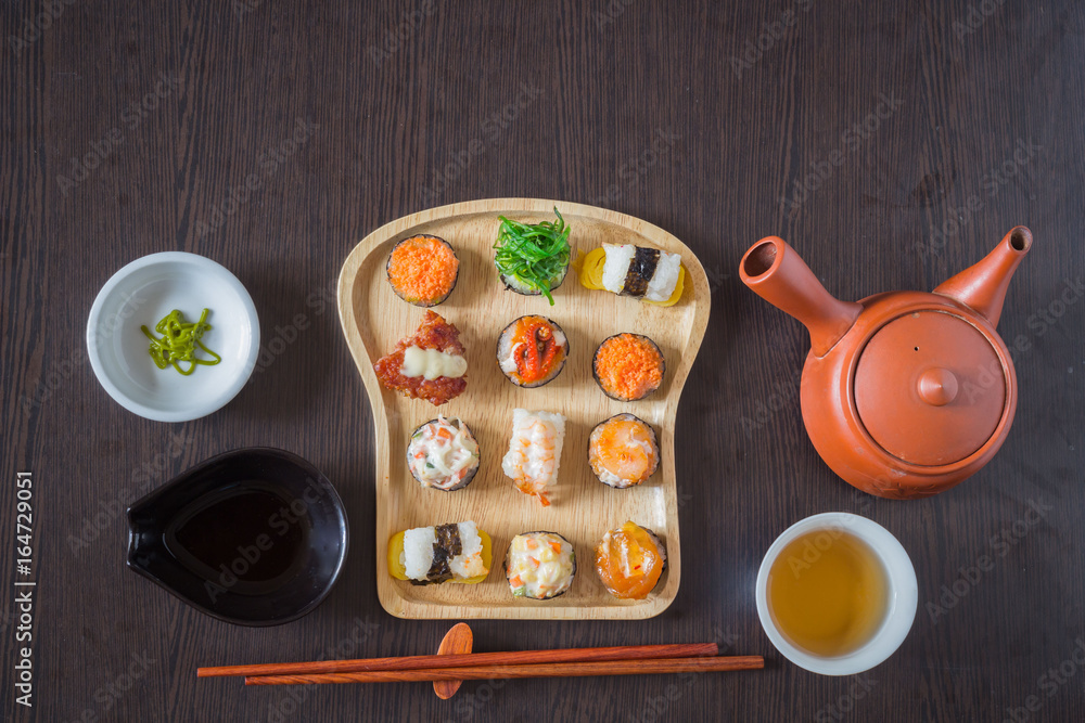 Sushi with salmon, prawn, avocado, cream cheese. Sushi menu. Japanese food.Top view.