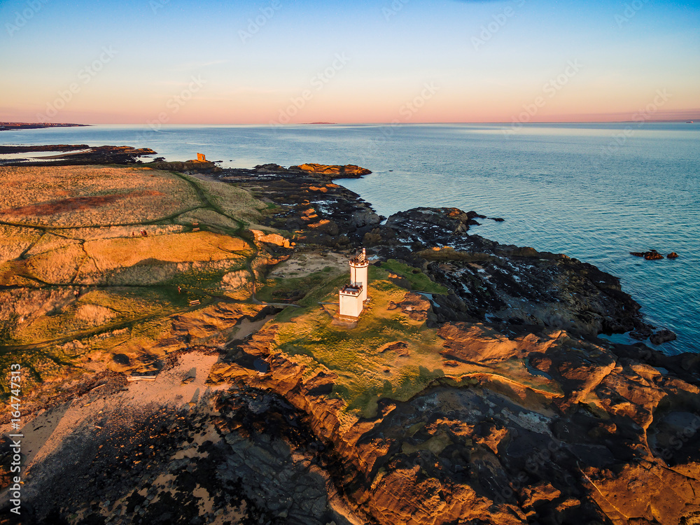 Aerial view of Elie Ness Lighthouse on the coast of The Kingdom of Fife. Scotland, UK
