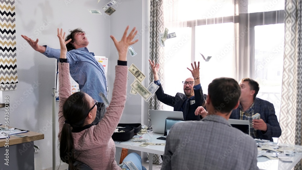 Economists celebrate an unexpected financial success in the office of the company. Happy people throw up money,