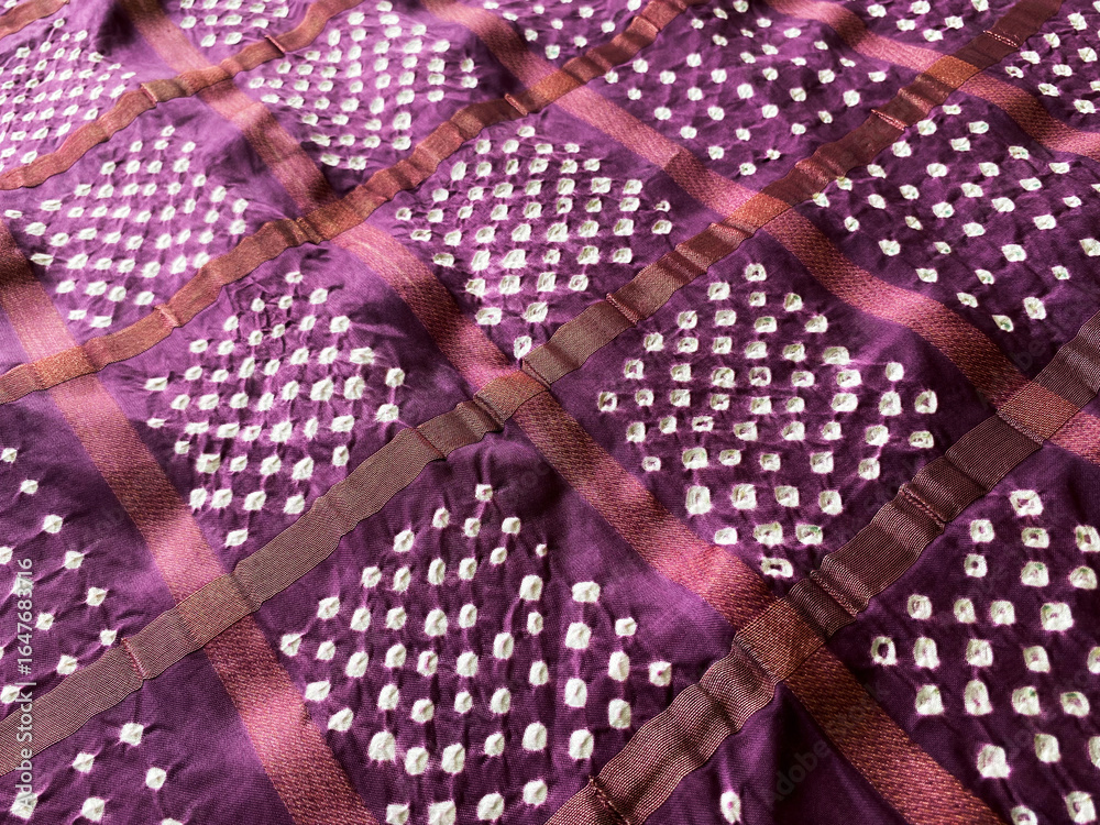 This vine gaji fabric showcases intricate white bandhani dots, gracefully arranged to highlight its artisanal charm.
