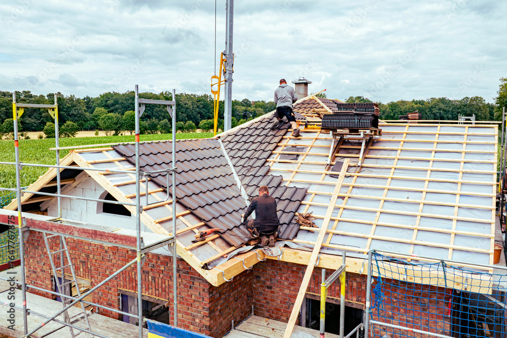 Wohnhausbau - Dachdeckerarbeiten beim Eindecken eines neuen Einfamilienhauses, Luftaufnahme.