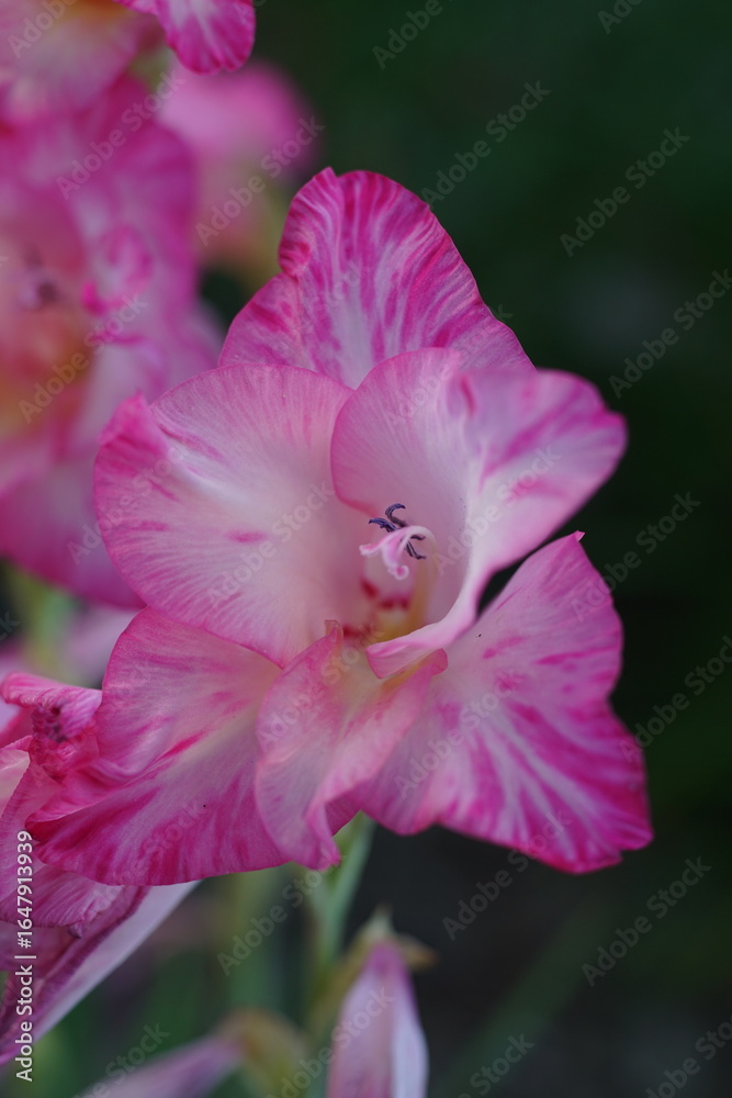 Gladiolen stilvoll und positiv wirkend als Schönheit in pink und weiß vor grün als Hintergrund