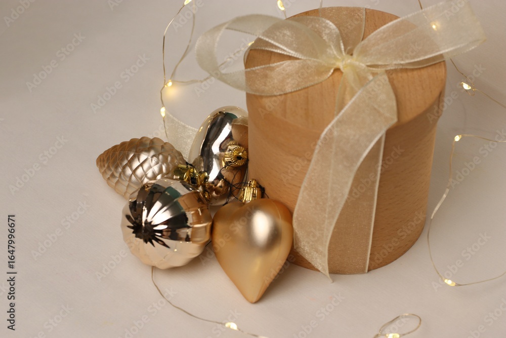 A festive wooden gift box with golden Christmas toys and warm garlands is the perfect photo for winter holiday campaigns, packaging design, postcards, banners, social media, and e-commerce.
