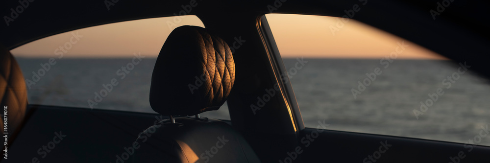 Interior view of a car with a leather seat, overlooking a sunset by the ocean. The scene captures a serene atmosphere with warm colors.