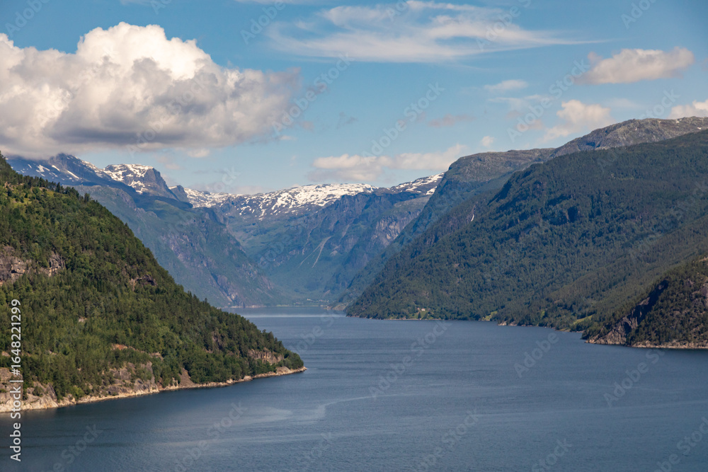 Beautiful Clear Summer Day on Eidjord, Norway with Clouds and Snow-Capped Mountains