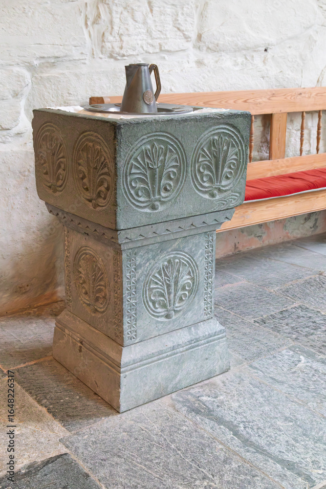 Carved Stone Baptismal Font and Pitcher in Ancient Utstein Abbey Klosterøy, island, Stavanger, Norway,