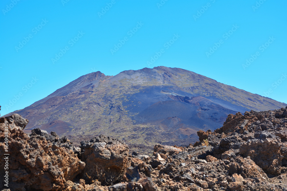 Pico Viejo volcano view through rocks, which is part of the Teide National Park in Tenerife, Canary Islands.