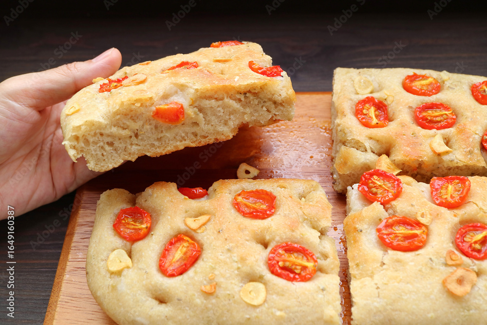 Hand Picking Up a Slice of Mouthwatering Freshly Baked Garlic and Tomato Italian Focaccia Bread