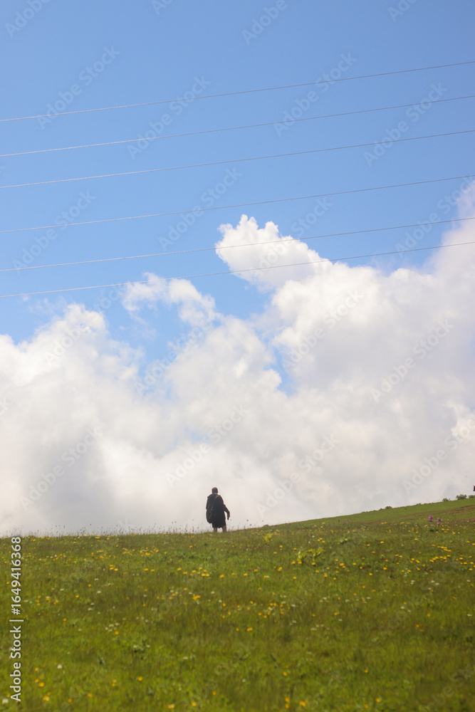 One tourist against the backdrop of mountains and clouds in Gomismta, Guria, Georgia