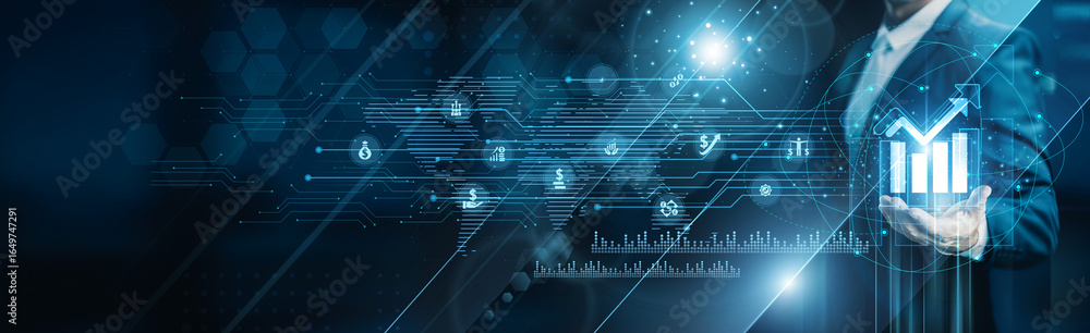 Businessman holding building of investment strategies, portfolio management risk analysis forecasting returns automation financial planning capital markets growth, and wealth optimization.