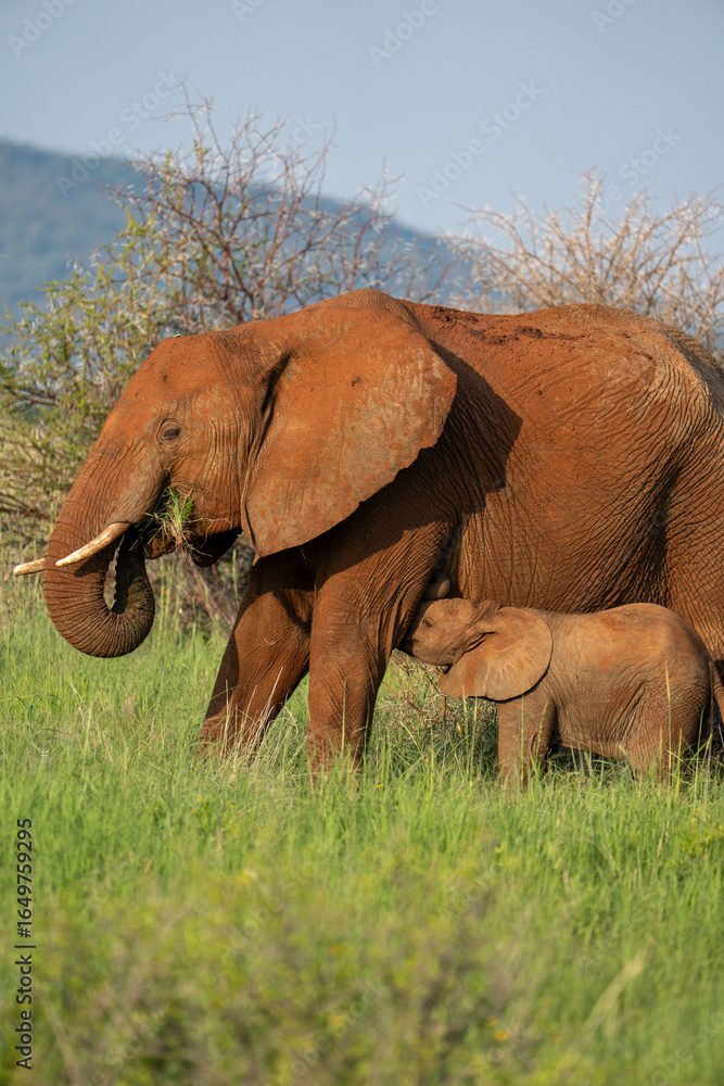 Herd of elephants with cute young calves spotted on safari in Pilanesberg National Park, South Africa.