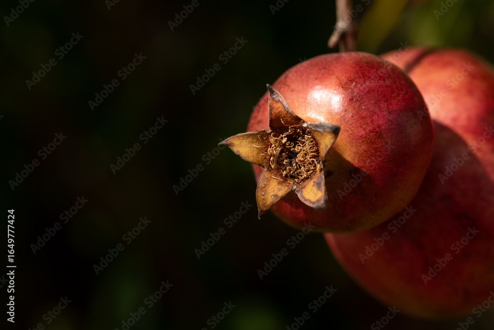 Two small wild pomegranates hang together on a tree. The sun shines on the fruit. There is plenty of space for text.
