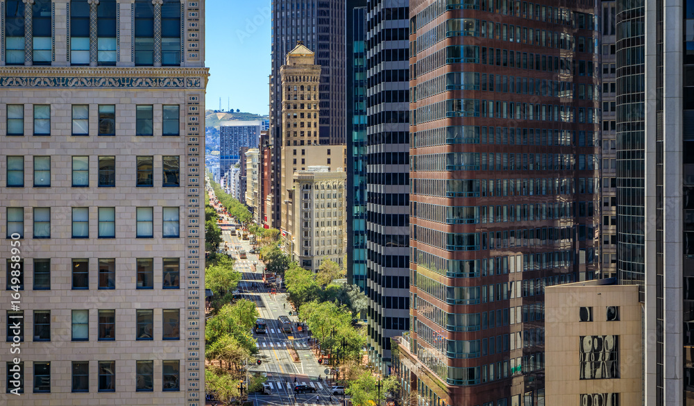 View down Market Street with iconic skyscrapers in San Francisco, California