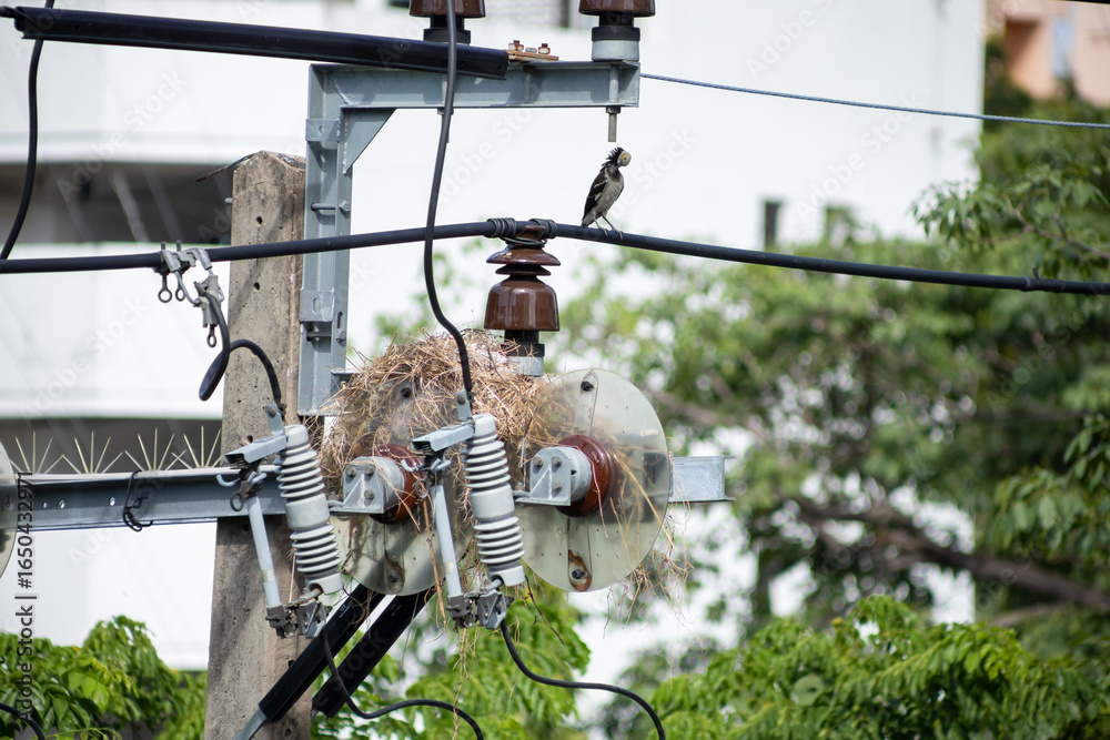 Siamese Pied Starling bird make a nest on the electric pole