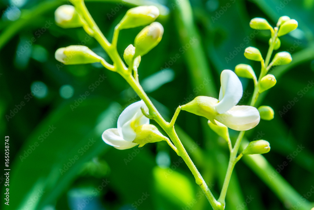Sophora japonica tree. tree leaves. Acacia. Sophora japonica flowers. Blurred Background of green leaves.