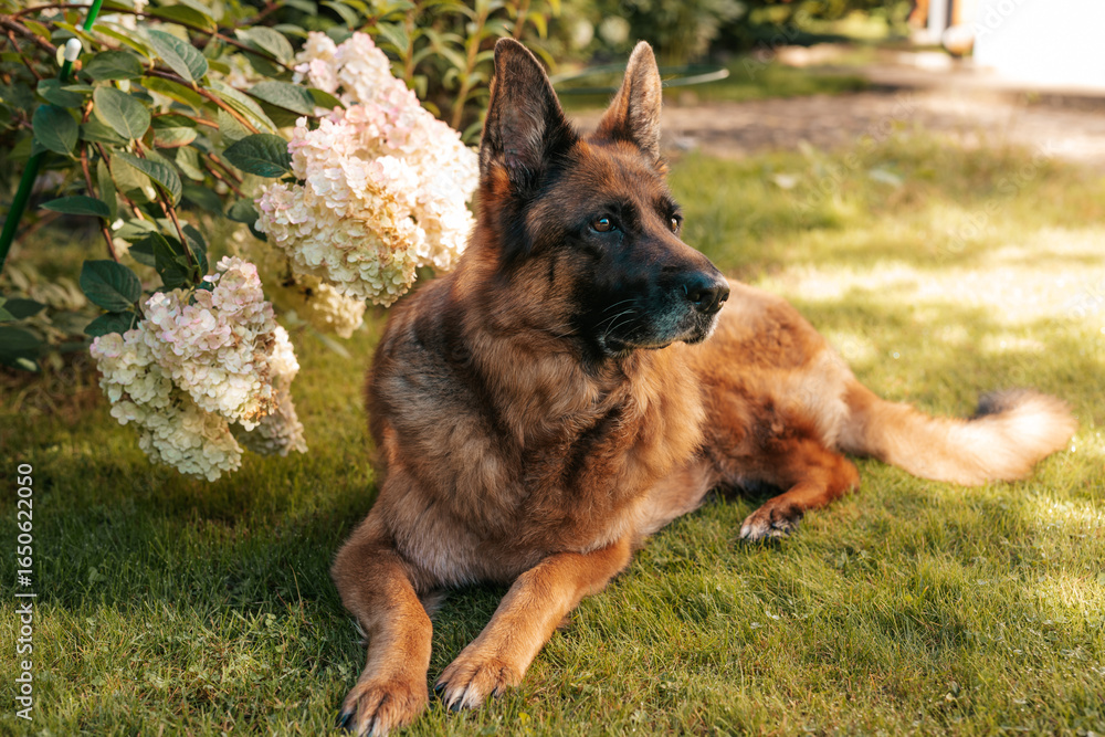 Portrait of an adult German shepherd dog in a garden. Purebred dog lying on the grass with flowers in the yard in summer.