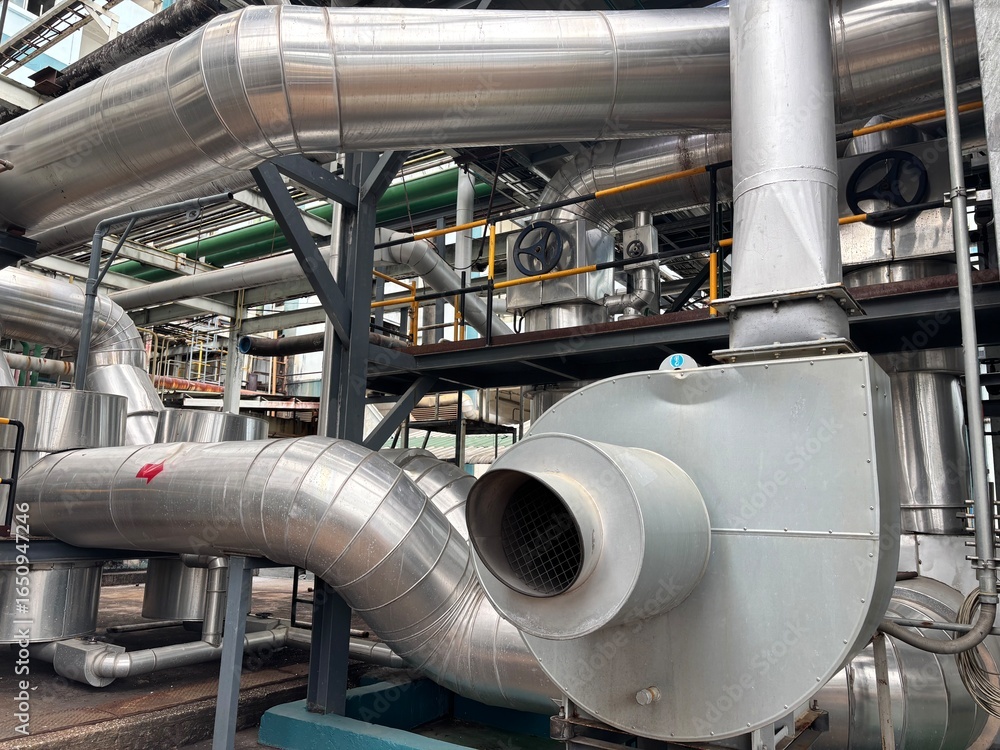 The image shows two parallel industrial pumps with blue bodies and yellow motors. A complex network of pipes and valves connects the pumps, set against a backdrop of large tanks and yellow railings.