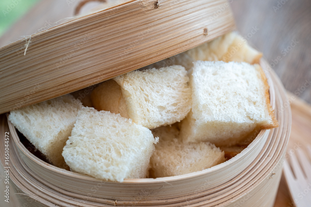Freshly Steamed Bread Cubes in Bamboo Steamer